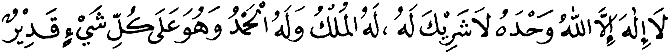 "Laa ilaaha illallahu wahdahu laa syarikalahu, lahul mulku wa lahul hamdu wahuwa ala kulli syaiin qodir." (Tidak ada Tuhan kecuali Allah yang Maha Esa yang tidak ada sekutu bagi-Nya, bagi-Nyalah segala kekuasaan dan pujian. Dan Dia atas segala sesuatu Maha Kuasa) (HR. Ahmad)